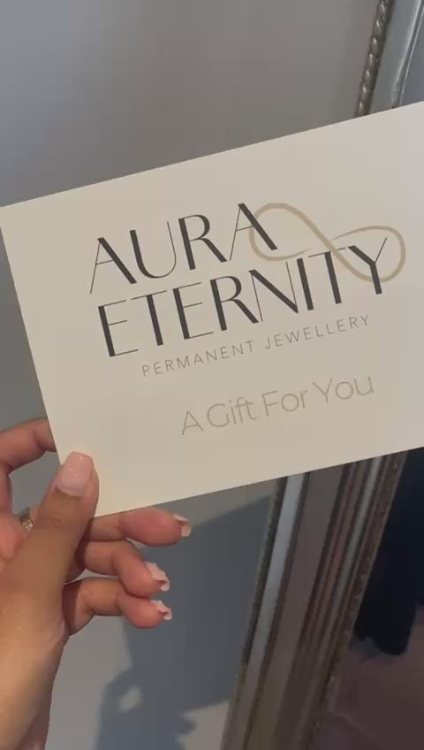Not sure which piece of jewellery to choose? Let them decide with an Aura Eternity Gift Card! Perfect for any occasion, our gift cards allow the recipient to select from our collection of permanent bracelets, anklets, necklaces, and rings. Each gift card can be redeemed at our studio in Birmingham’s Jewellery Quarter, making it a meaningful and thoughtful present that they’ll remember.